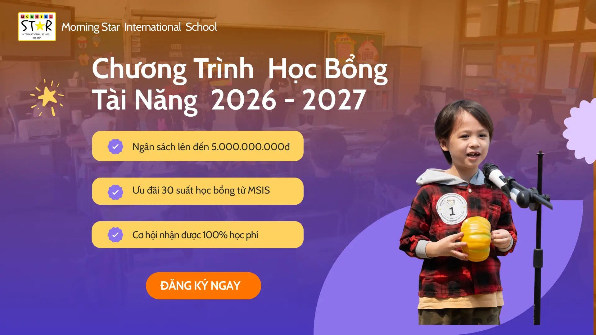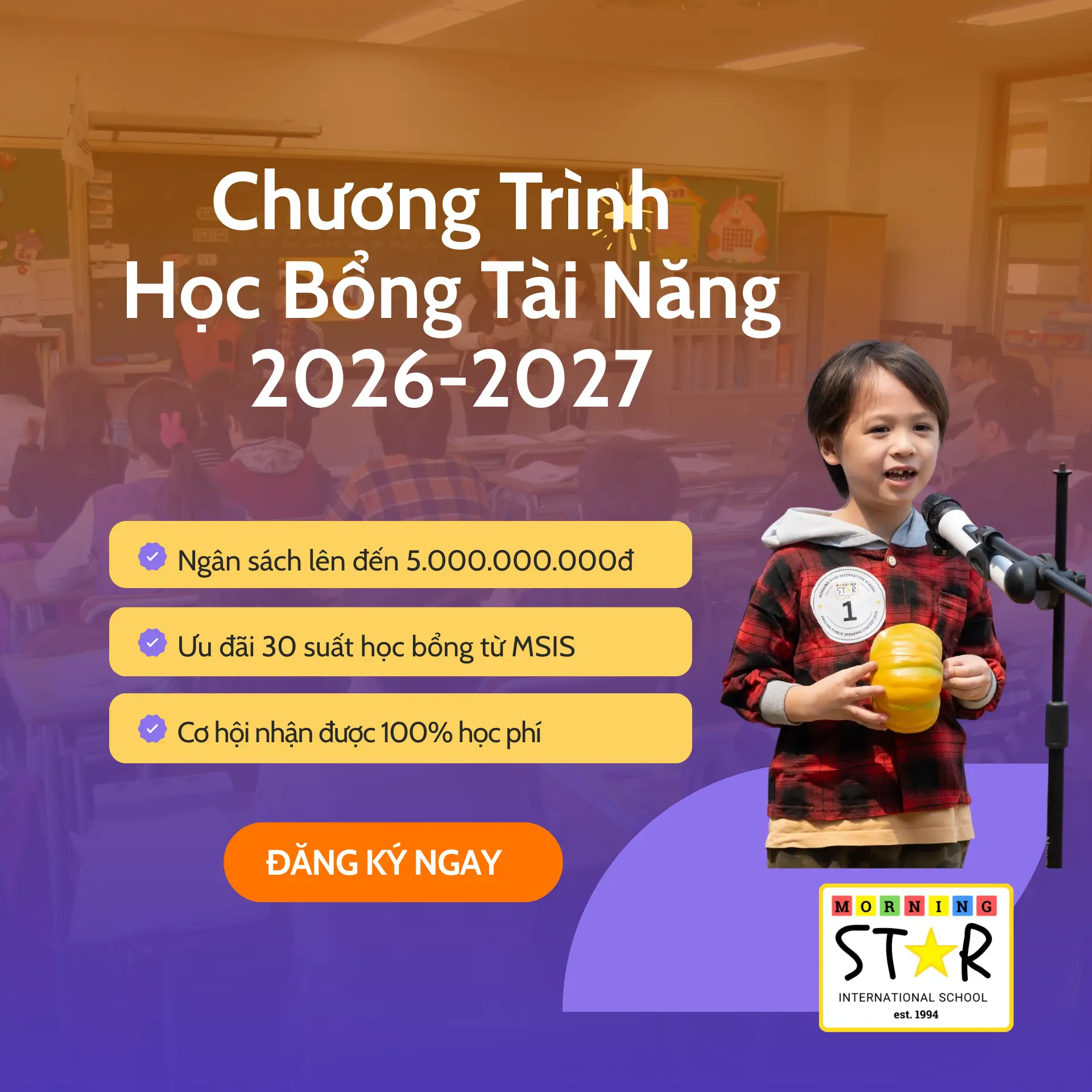 Chương trình Học bổng Tài năng MSIS (MSIS Talent Scholarship Program) là chương trình học bổng hàng năm dành cho Học sinh từ lớp 1 đến lớp 5, nhằm tôn vinh những nỗ lực và thành tích xuất sắc trong học tập và hoạt động ngoại khóa, đồng thời trao cơ hội xây dựng Hành trình Học tập và Trưởng thành Hạnh phúc tại Morning Star International School với giá trị học bổng lên tới 100% học phí.